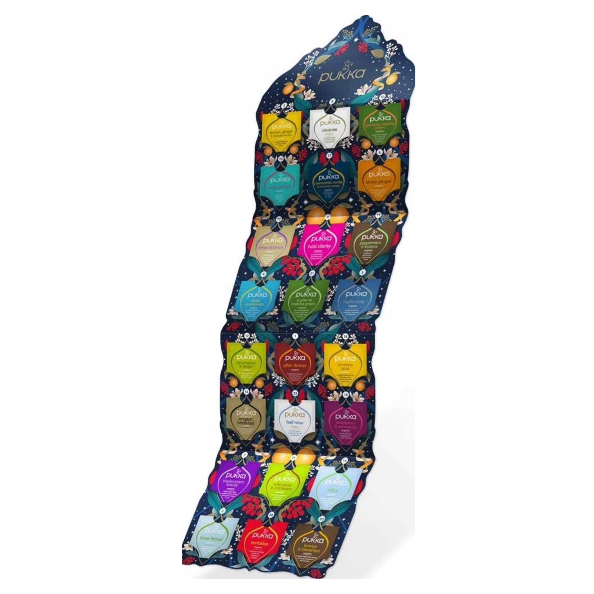 Atrask šventinę nuotaiką su „Pukka Organic Tea“ advento kalendoriumi. Kiekvieną dieną iki Kalėdų mėgaukis nauju ekologiškos arbatos skoniu ir leisk sau trumpą poilsio akimirką su natūralių žolelių aromatais.