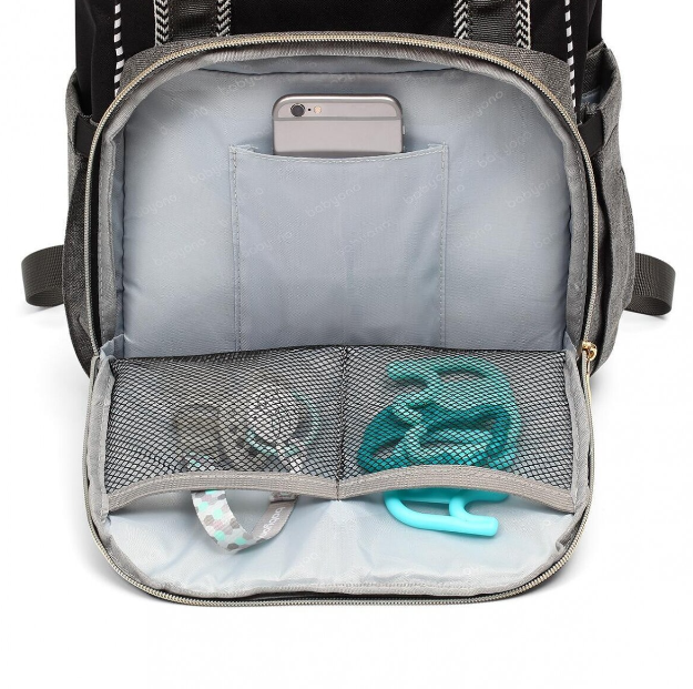 • 12 specialių kišenių, iš jų 2 termo kišenės buteliukams, kišenė šlapiems daiktams, lengvai pasiekiama kišenė telefonui ar čiulptukui, taip pat kišenė nešiojamajam kompiuteriui.