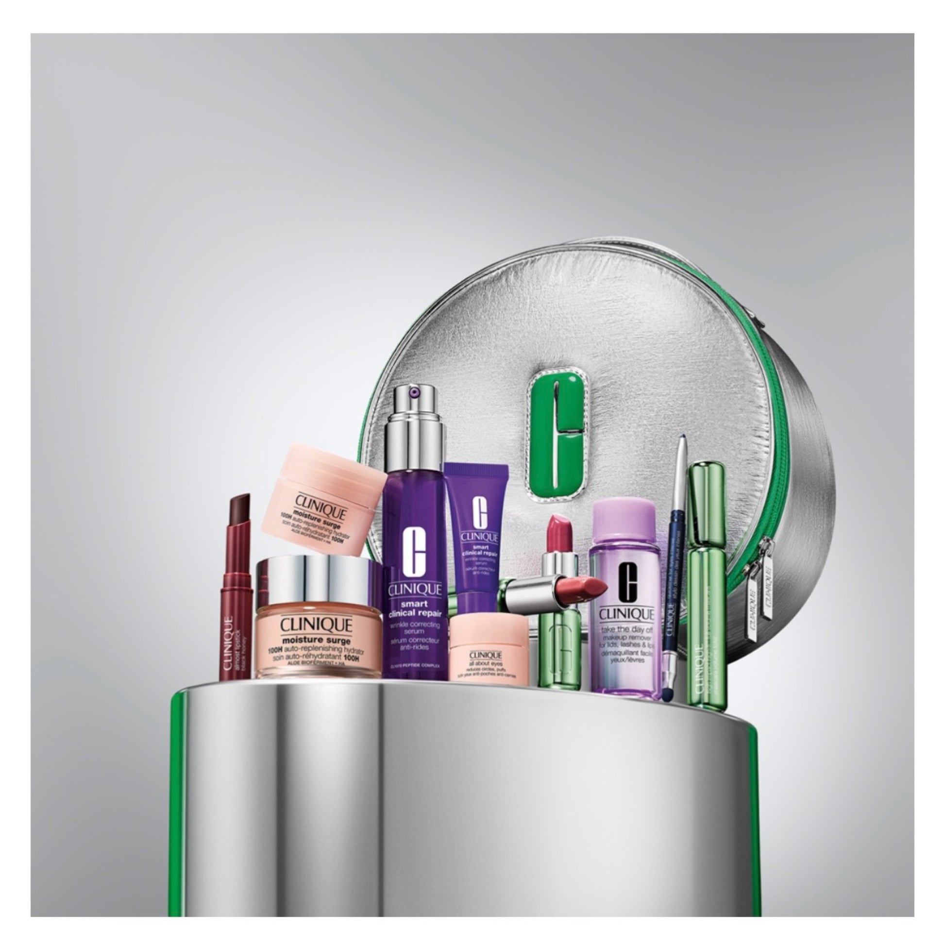 Viduje – geriausiai vertinami „Clinique“ produktai: drėkinimas, valymas, paakių priežiūra, serumai, tušas, lūpų priemonės ir akių pieštukas. Tai idealus rinkinys tiek ištikimoms „Clinique“ gerbėjoms, tiek toms, kurios nori išbandyti viską iš karto.