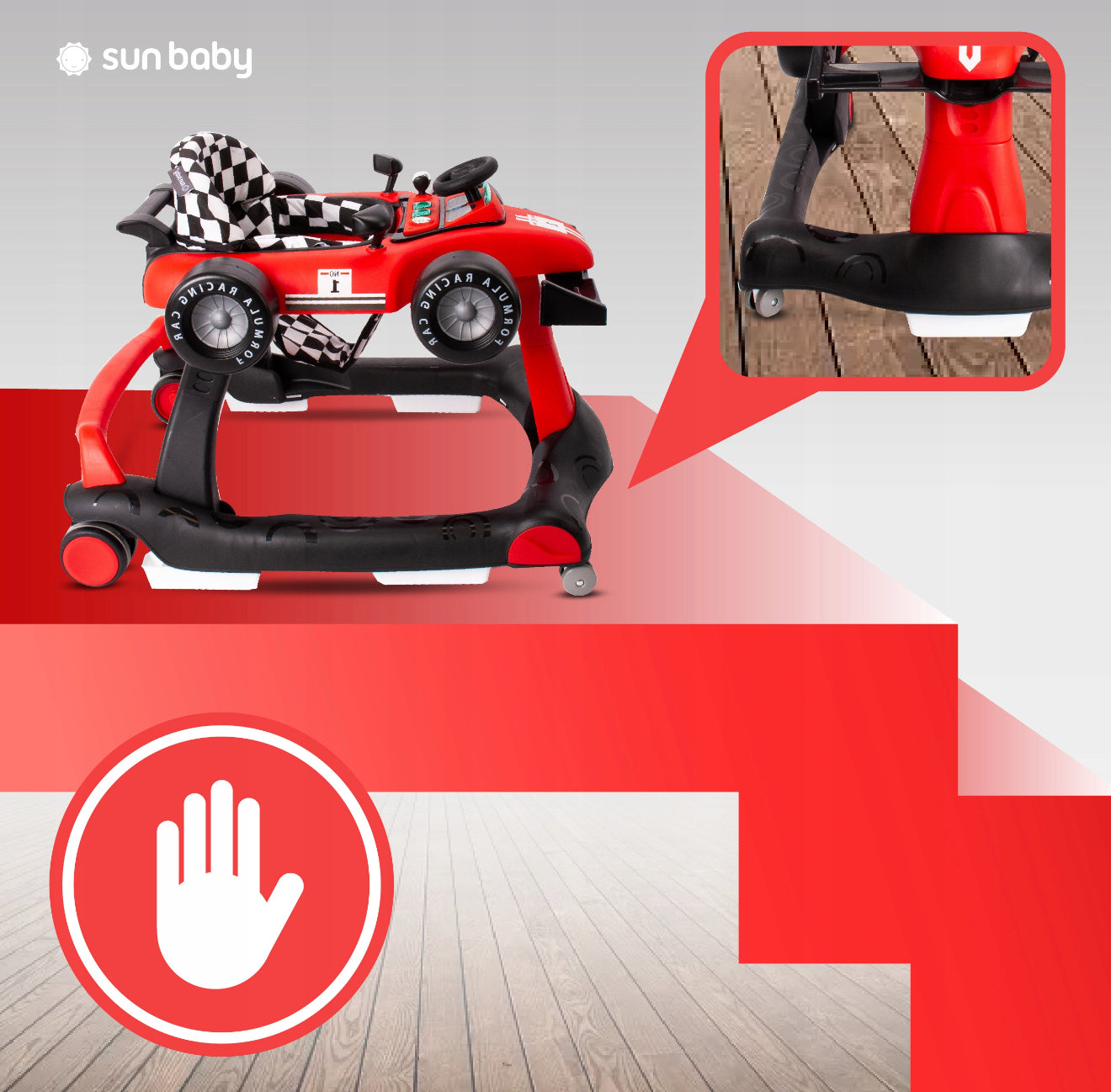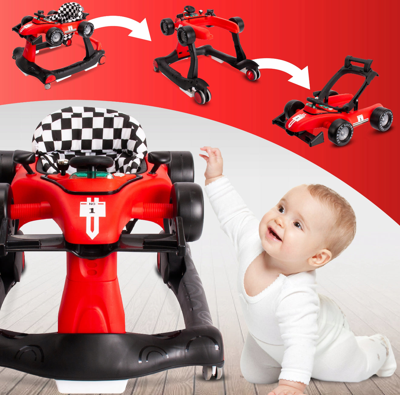 Ši lenktyninės mašinos formos vaikštynė ne tik padeda lavinti motoriką ir pirmuosius žingsnius, bet ir suteikia daug džiaugsmo bei žaidimo akimirkų!