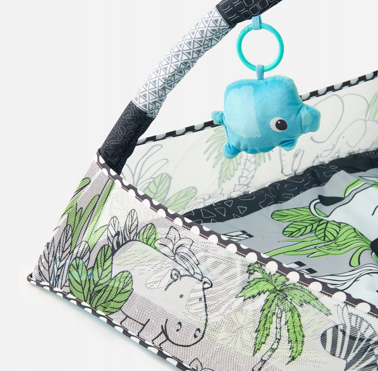 - Interaktyvūs žaislai – kilimėlyje yra spalvingi gyvūnų formos pakabukai (dramblys, antis, jūrų liūtas), veidrodėlis ir kramtukai.