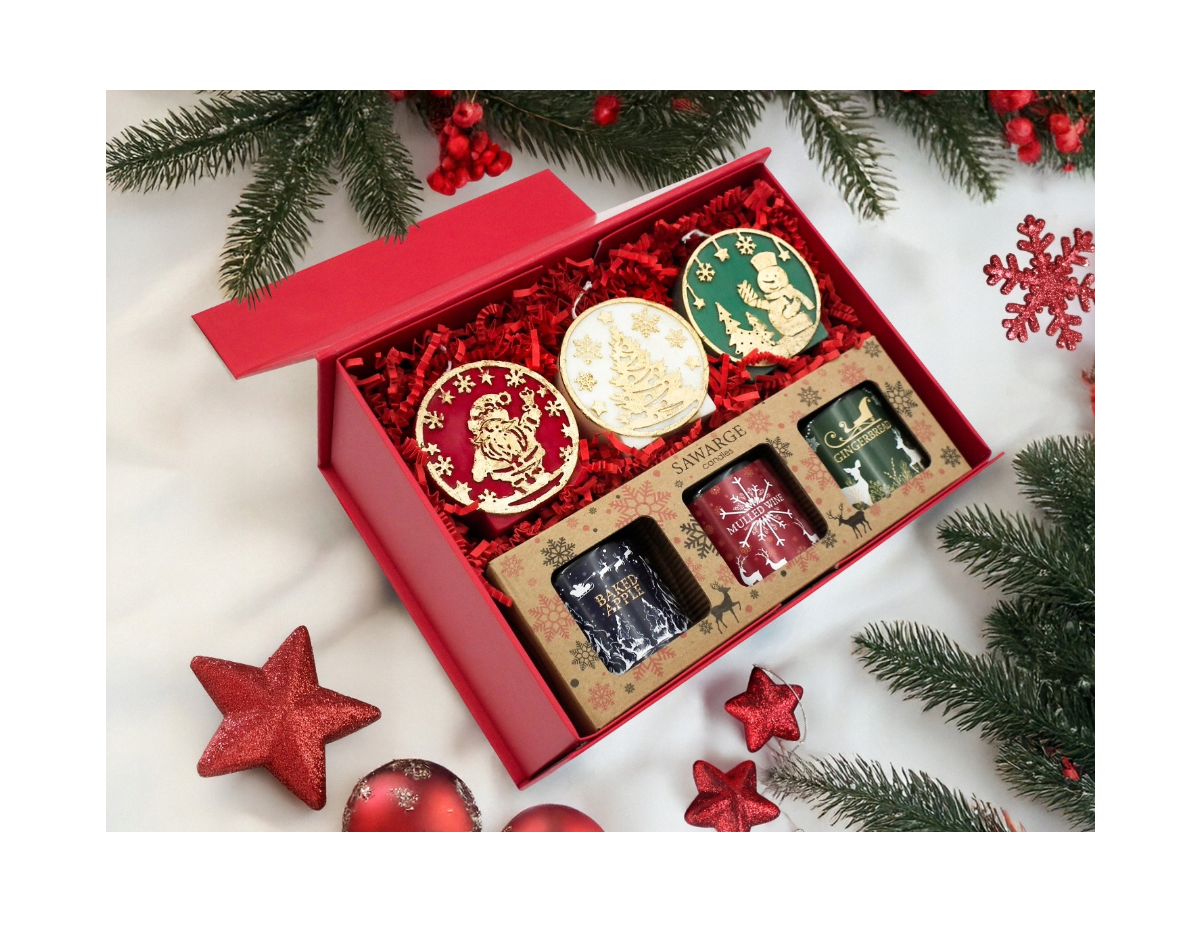 Atrask tobulą kalėdinės dovanos idėją – elegantišką rankų darbo sojų žvakių rinkinį, supakuotą į prabangų raudoną dovanų dėžutę su magnetiniu uždarymu ir šventine aplikacija.