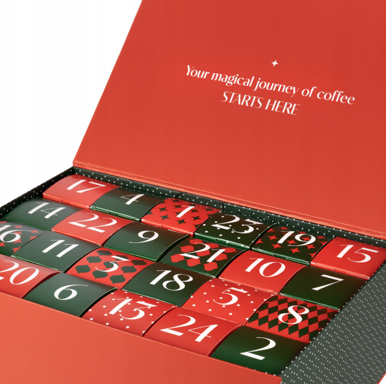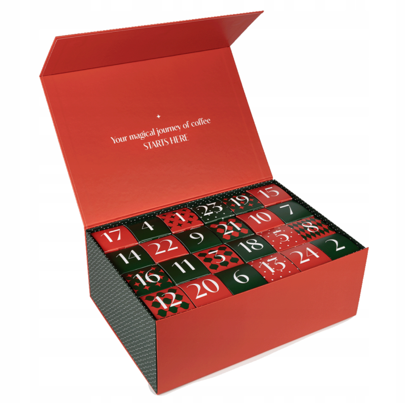 Kava supakuota į elegantišką, blizgantį kalėdinį dėžutės dizainą, o kiekvienas mini langelis slepia atskirą staigmeną. Tai puiki dovana sau ar artimam žmogui, vertinančiam kokybišką kavą ir šventinę nuotaiką.