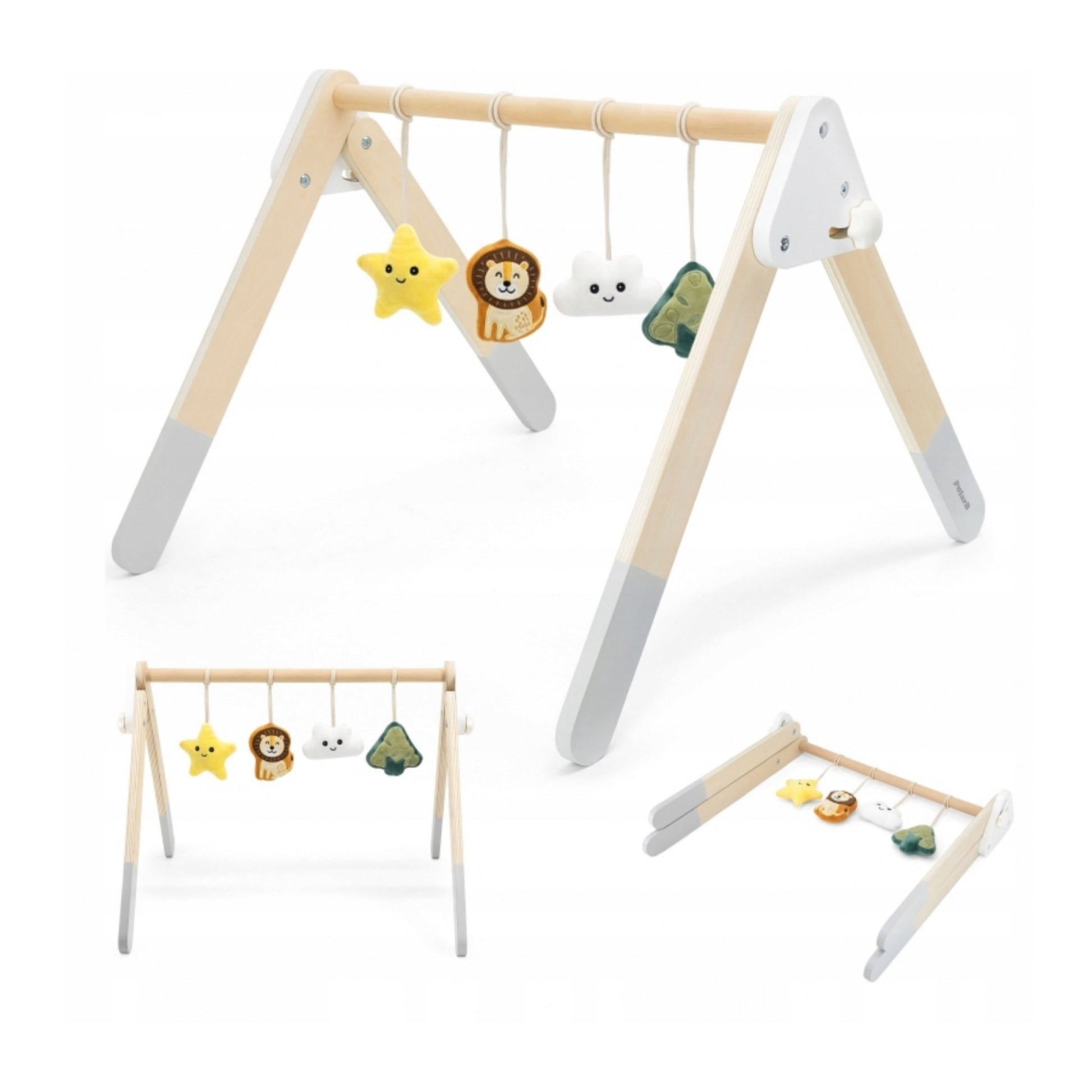 Medinis žaidimų stovas su pakabinamais žaisliukais – tai puikus pirmųjų žaidimų draugas kūdikiui nuo pat pirmųjų gyvenimo dienų. Švelnios spalvos, mieli personažai (žvaigždutė, liūtukas, debesėlis ir eglutė) bei malonūs garsai skatina mažylį tyrinėti, lavina jo pojūčius bei motorinius įgūdžius.