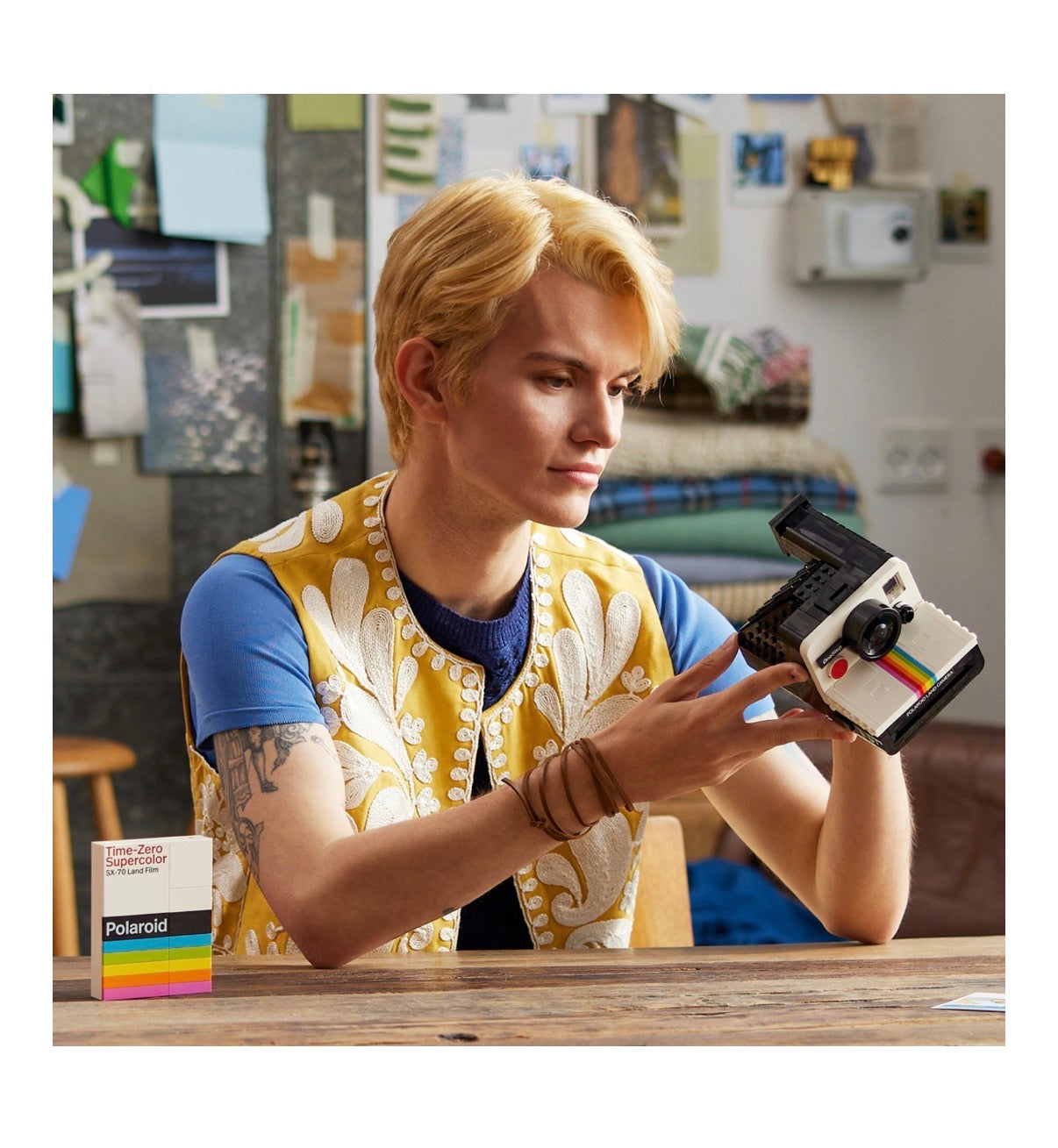 - Konstruojama juostos „Time-Zero Supercolor SX-70 Land Film“ pakuotė. Joje yra 3 iliustruotos „nuotraukos“: „Polaroid“ išradėjo Edwin H. Land, LEGO® namo ir gerbėjo dizainerio sesers, įkvėpusios šį kūrinį.