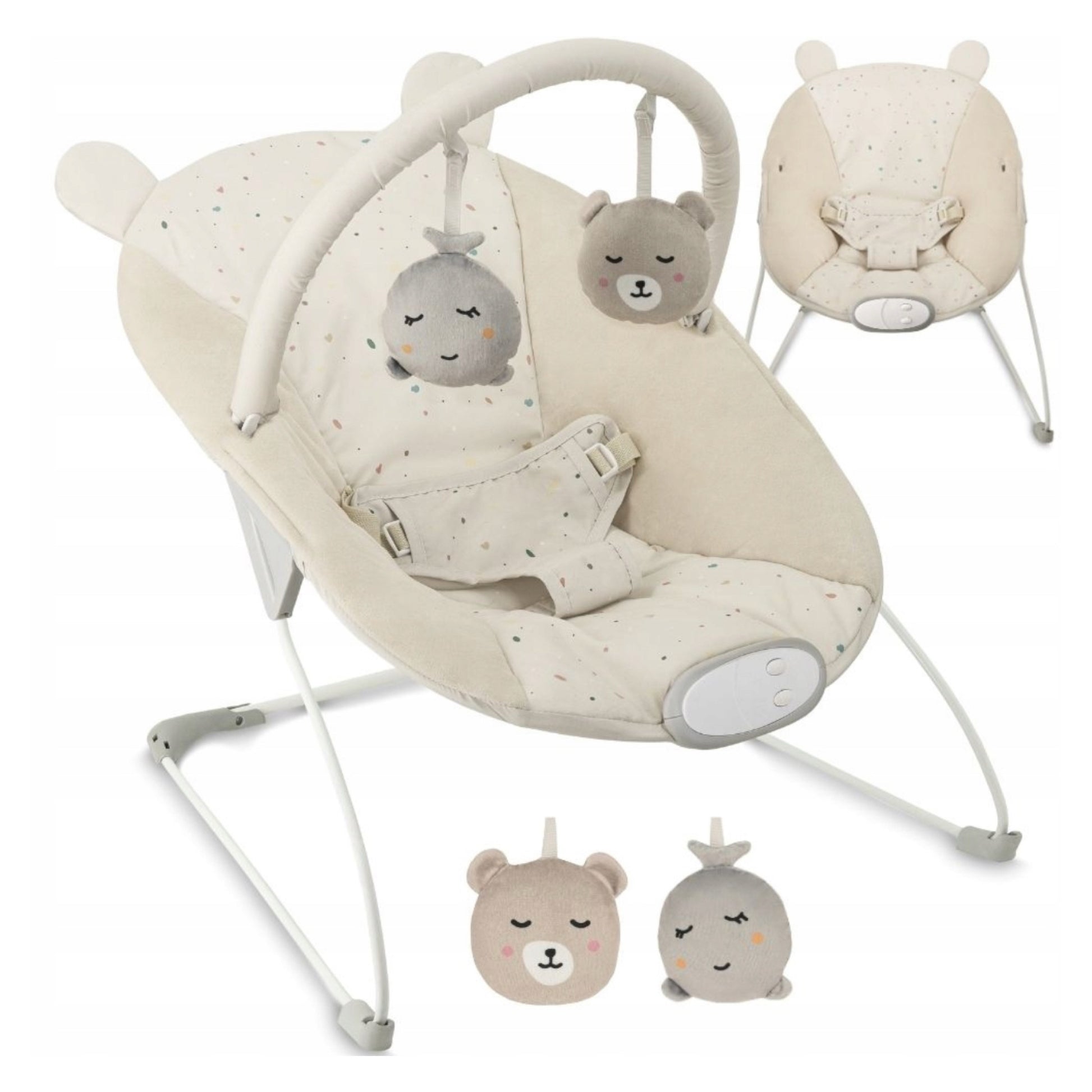 - Nuimamas žaislų lankelis su dviem sensoriniais žaislais (barškučiu ir cypiančia žaisliuku);