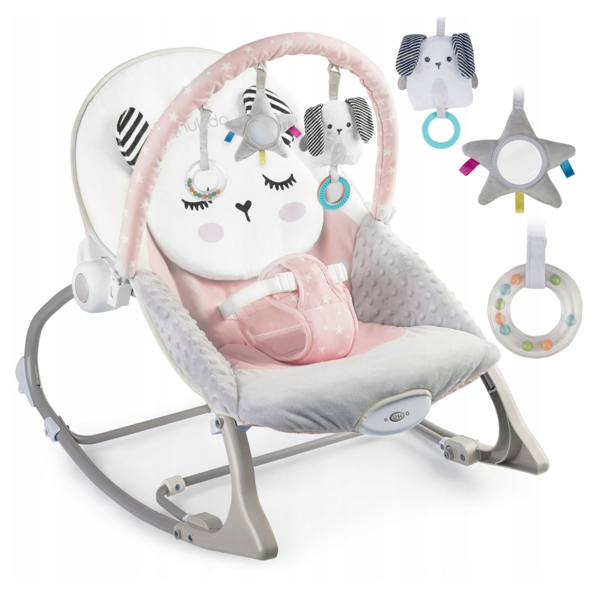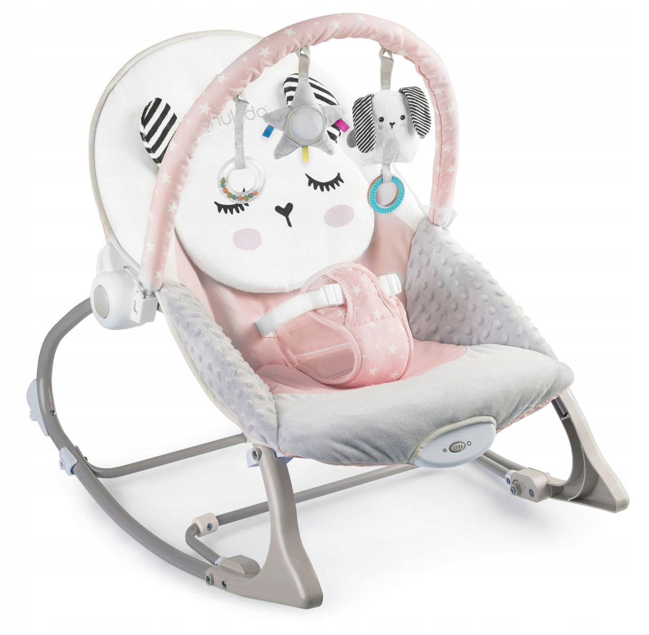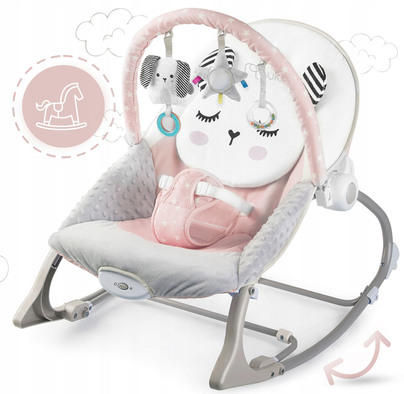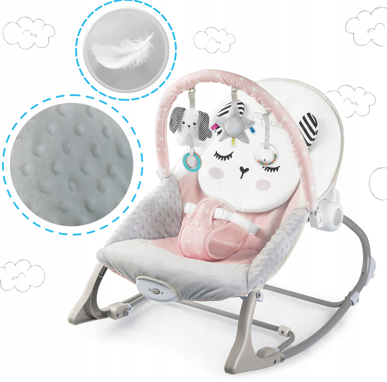 - Nuimamas žaislų lankelis su minkštais žaisliukais, skatinančiais pojūčių ir motorikos vystymąsi;