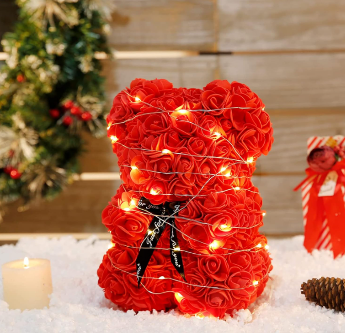 Rožinis rožių meškiukas su LED švieselėmis – romantiška dovana jai