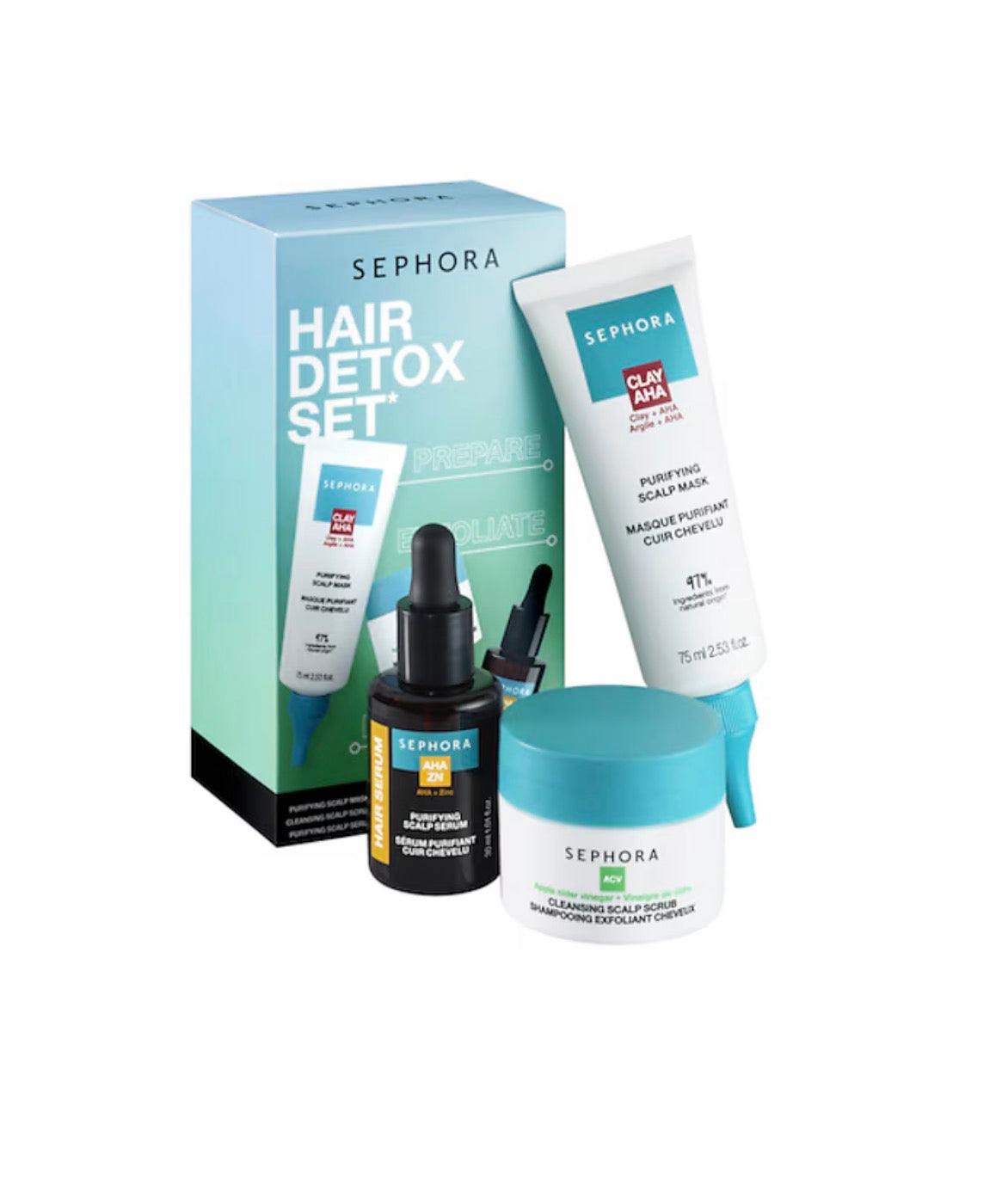 „SEPHORA COLLECTION“ plaukų valymo ir detoksikacijos rinkinys pašalina riebalų perteklių ir nešvarumus, kurie apsunkina plaukų šaknis. Diena iš dienos galvos oda valoma ir gaivinama, išlaikant natūralią jos pusiausvyrą. Šveičiamasis šampūnas pašalina galvos odos nešvarumus, valomoji kaukė atkuria plaukų apimtį ir lengvumą, o valomasis serumas kasdien sulėtina plaukų riebalavimosi procesą.