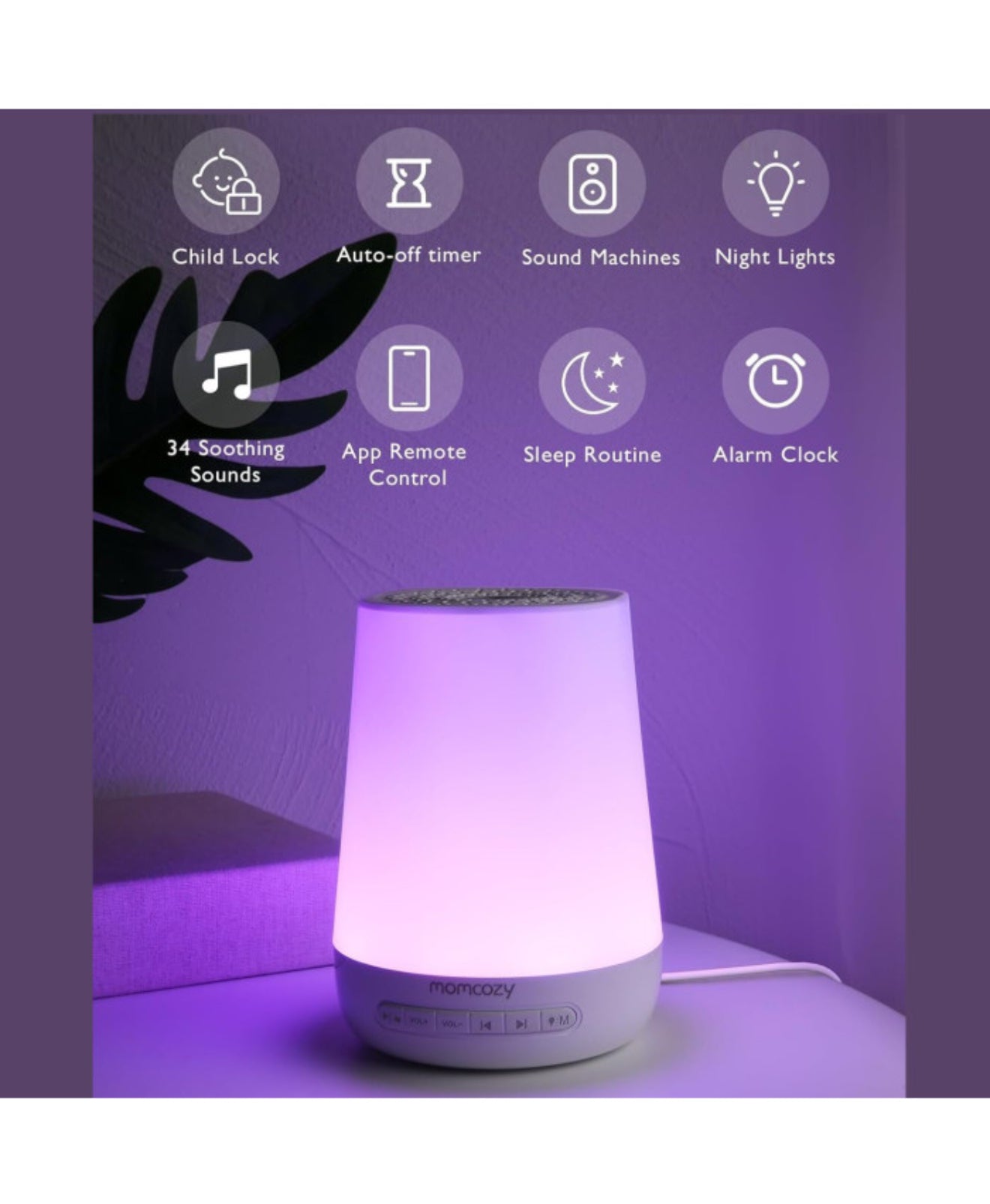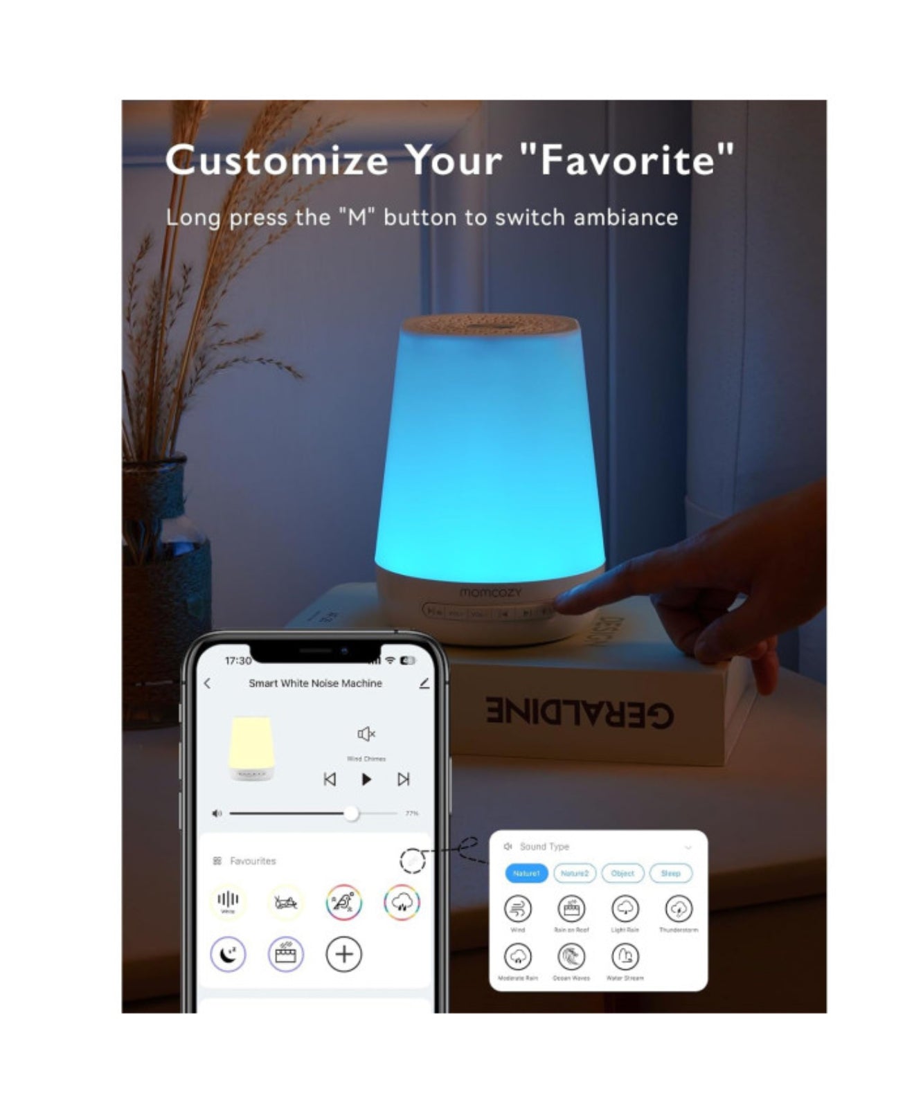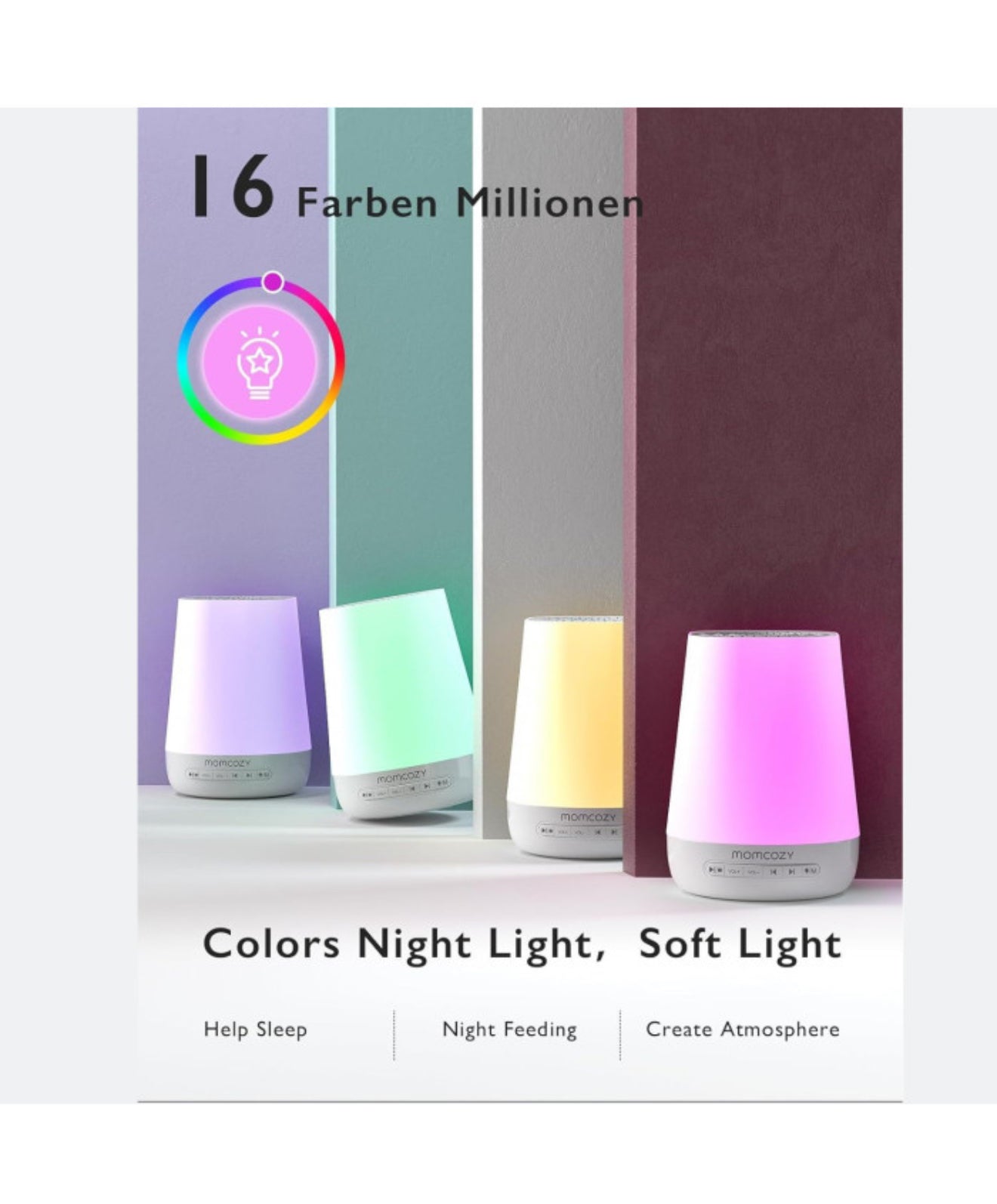 Atraskite ramybę su MOMCOZY baltojo triukšmo aparatu–šviestuvu. Įrenginys siūlo net 34 skirtingus garsus – nuo baltojo triukšmo iki lopšinių ir gamtos garsų, o 7 spalvų LED lemputė sukuria jaukią atmosferą Jūsų mažyliui ir visai šeimai. Patogus nuotolinis valdymas telefonu, reguliuojamas garsumas, laikmatis ir įkraunama baterija leidžia aparatą naudoti tiek namuose, tiek kelionėje.